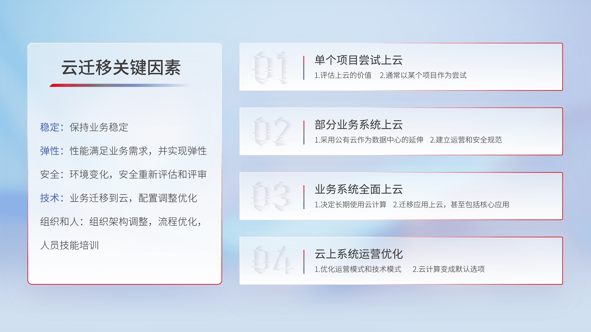 结合实际业务,,,从规划设计、、、云平台选型、、、云原生改造、、、、数据迁移、、、集成交付,,,,迁移全过程为客户识别最佳上云路径,,做好风险识别管理,,,设计网络架构、、、身份权限、、、安全审计合规、、、操作审计、、、、日志审计、、、监控告警策略、、、、多站点容灾设计等,,对云上基础设施进行整体规划,,提升IT治理水平,,,以满足弹性、、、高可用、、、高性能的需求。。。。